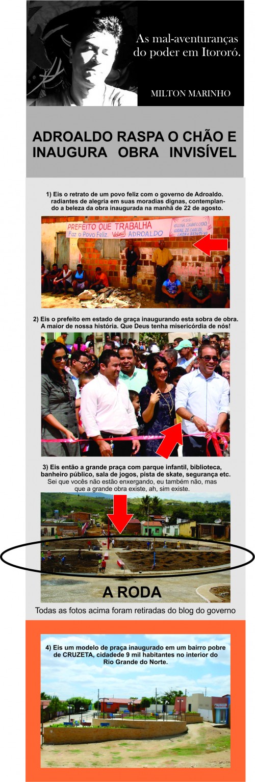 O jornal oficial rodado em 4×1 circulava de mão em mão, anunciando em fontes garrafais, “Times New Roman bold”, (somente uma licença estilística) uma série de obras, porém na verdade, somente uma obra existia de direito para deleite popular: A RODA. Proclamava os meios de comunicação, diga se de passagem em sua maioria, oficiais. As peças ou os “spots” de rádio retiniam em nossos ouvidos, de modo ensurdecedor, ou melhor, admoestador. Adroaldo vai inaugurar a roda! Adroaldo vai inaugurar a roda!… Ah, a roda. A rótula, e meus olhos se embotavam de cimento e lágrima. Continue reading “DIA DA CIDADE EM ITORORÓ, ADROALDO INAUGURA A RODA DEPOIS DE 5.500 ANOS DE INVENTADA” »