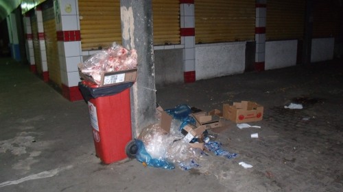 No início da noite desta sexta-feira, a nossa reportagem foi chamada por barraqueiros e feirantes da Central II, que denunciavam a fedentina e sujeira do local, cuja coleta de lixo não acontecia desde a última quarta-feira. Chegamos ao local minutos depois, mas a montanha de lixo já havia sido recolhida por uma picape Strada da prefeitura, veículo que vem fazendo a coleta de lixo na cidade, apesar dos altíssimos aluguéis pagos aos caminhões sucateados, que nunca dão conta do serviço.