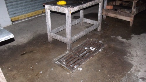 Sujeira nas bancas e corredores de comercialização de carne suína