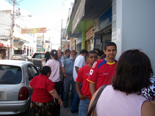 Hoje pela manhã, quando passávamos em frente ao banco, fomos abordados por populares, que aos gritos nos pediam socorro, como se tivéssemos o poder de resolver tal problema. Cumprindo o nosso papel de informar, fotografamos a imensa fila, fora e dentro do banco, na esperança de que alguma coisa seja feita em prol da população.
