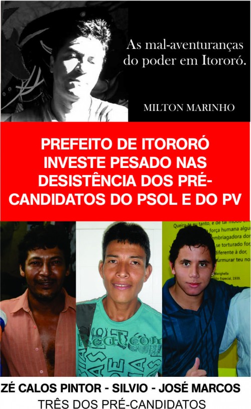 ITORORÓ: Depois de várias tentativas que o prefeito Adroaldo fez para impedir que alguns pré-candidatos se filiassem aos partidos do PSOL e ao PV, sem êxito algum, ele o prefeito medonho, agora investe em uma sórdida campanha, caçando os mesmos pré-candidatos oferecendo vantagens pessoais para eles, num desrespeito sem igual. Afim de quê? Afim, de desmoralizá-los perante a sociedade em que vivemos. Afim, de fazer com que eles sejam homens desonrados e que a política seja a coisa mais nojenta do mundo quando assim é praticada. Essa é a visão deste “governinho” sobre as pessoas de bem de nossa cidade: Fazer com que todos nós sejamos mercadorias nessas prateleiras da imoralidade. Nossos cidadãos nunca viram entre nós, tamanha agressividade e tamanha descompostura de um gestor público. A safadeza desse governo, para atravessar os adversários, as regras, não tem limites, sua busca pela permanência no poder é terrível.