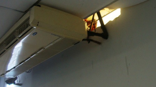Conserto em um aparelho de ar condicionado deixou um buraco aberto na parede, comprometendo a segurança da agência.