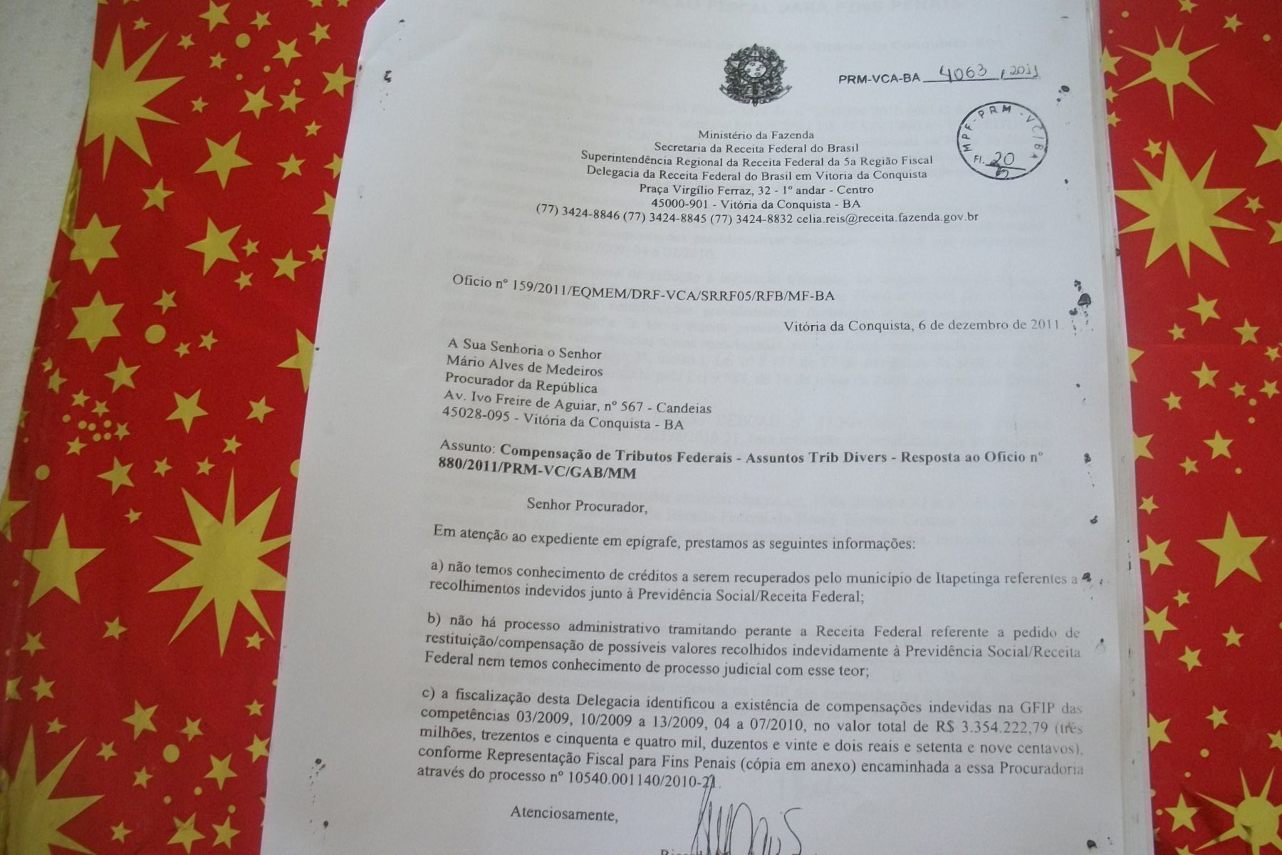 ITAPETINGA: Muito tem-se discutido se a Bernardo Vidal & Associados recuperou ou não os supostos créditos previdenciários a que o município teria direito. Um documento da Receita Federal, entretanto, põe por terra todos os falsos argumentos do prefeito Zé Carlos, sua assessoria e também da Bernardo Vidal, que montou uma verdadeira encenação na Câmara Municipal, nesta terça-feira, para tentar convencer a própria equipe do prefeito, de que a malfadada operação foi ‘legal’.