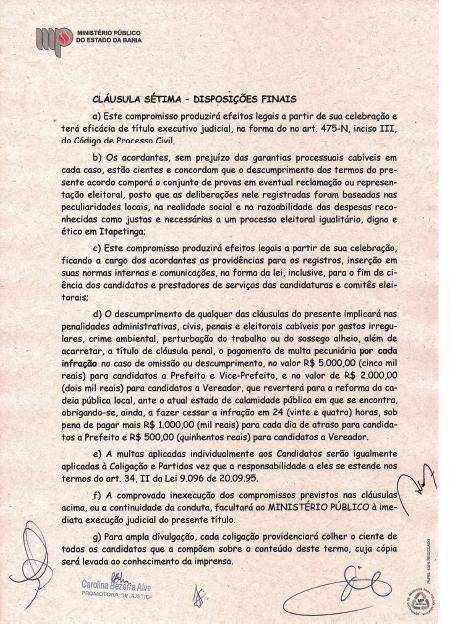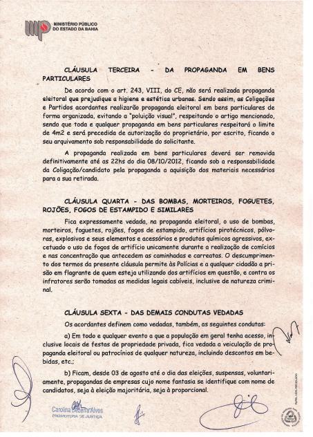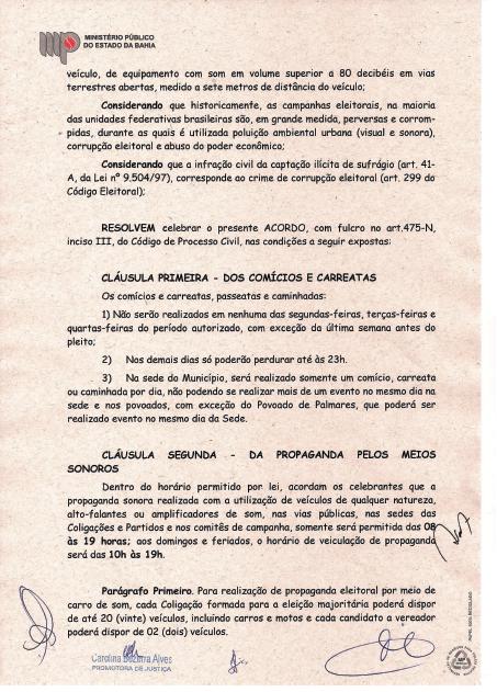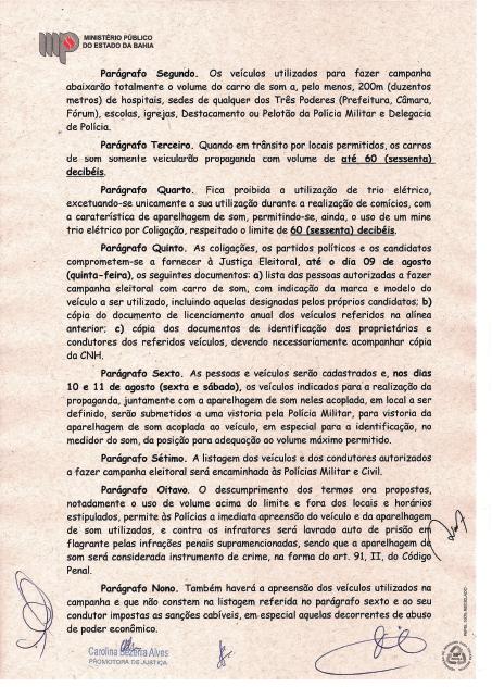 Para tanto, foi realizado um Termo de Acordo Judicial (TAJ) entre as autoridades e as coligações, estabelecendo as condutas e os limites a serem respeitados pelos candidatos, partidos e coligações. Dentre as regras estabelecidas no documento, destacam-se a limitação do número de carros de som por coligação, limite dos decibéis nos aparelhos sonoros utilizados nos carros e motos de som, proibição de fogos de artifício, regulação dos dias para realização de comícios, carreatas e caminhadas, dentre outras exigências que terão que ser respeitadas pelos candidatos e sua respectivas coligações, sob pena de multa e outras sanções.