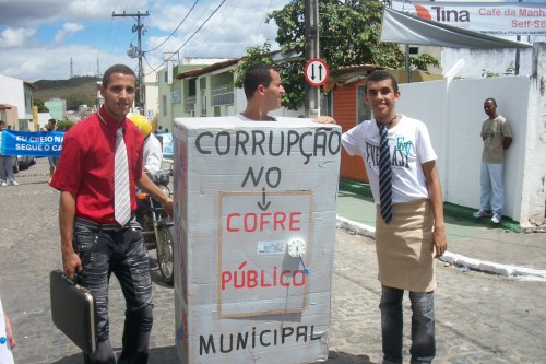 Não se contentando com a modesta decoração da igreja, o candidato a vereador mandou afixar no altar da ‘casa de Deus’ um banner enorme do PT, com estrelinha vermelha e tudo mais, no qual aparece a sua foto ao lado dos candidatos a prefeito e vice, Zé Carlos e Alécio, afrontando aos princípios protestantes que condenam a odiosa e pecaminosa prática da “idolatria a símbolos e imagens”.