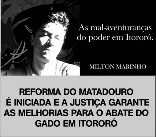 Era a última luz que havia no fim do túnel (A justiça), do lado da sociedade, tomou posição firme para que o problema do Matadouro Municipal fosse resolvido (Via acordo, há seis meses com a presença do Ministério Público e Governo), de nada havia adiantado até aquele momento. O governo do PT, do prefeito Adroaldo escorregava que nem quiabo para dar mais um calote no município. Porém desta vez ele deu com os “burros n’água”. Pois o “freguês” em questão era nada mais, nada menos que o Ministério Público que em defesa de toda a nossa sociedade, decretou o fechamento do Matadouro Municipal na última sexta-feira do mês de novembro, dia 30.