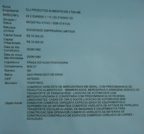 A CLJ Produtos Alimentícios não passa de uma lanchonete situada na Estação Rodoviária de Itapetinga, que comercializa apenas sucos, refrigerantes, doces e salgados e pertence a um amigo pessoal do prefeito José Carlos Moura, o famoso “Dadai do Biscoito”, que vem abocanhando licitação atrás de licitação na prefeitura, câmara municipal e na autarquia de água e esgotos SAAE, para realização de obras e fornecimento de todo tipo de material e serviços.