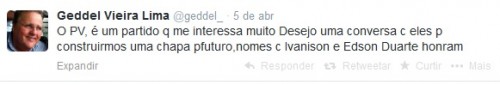 Usando o Twitter, Geddel colocou que pode se manter na briga pelo palácio de Ondina, atraindo o PV- Partido Verde . Nomes de Ivanison e Edson Duarte, quadros do PV, foram lembrados por Geddel, para uma chapa própria do PMDB.