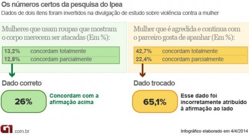 O Instituto de Pesquisa Econômica Aplicada (Ipea), órgão do governo federal, informou nesta sexta-feira (4) que errou ao divulgar na semana passada pesquisa segundo a qual 65,1% dos brasileiros concordam inteiramente ou parcialmente com a frase “Mulheres que usam roupas que mostram o corpo merecem ser atacadas”. De acordo com o instituto, o percentual correto é 26%.