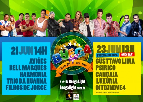 Para a sua 13ª edição, que será realizada nos dias 21 e 23 de junho, o Brega Light investe mais uma vez em grandes atrações de renome nacional. Aviões do Forró, Bell Marques, Gusttavo Lima, Harmonia do Samba, Psirico, Trio da Huanna, Cangaia de Jegue, Filhos de Jorge, Luxúria e Oito7Nove4 formarão a grade do evento com uma mistura de ritmos como nunca foi vista no São João da Bahia.