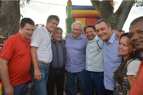 Na foto, Alfredo Cabral aparece ao lado de Rui Costa, Otto Alencar, dos deputados Rosemberg Pinto e Geraldo Simões, e do prefeito de Itapetinga, durante a passagem da comitiva pelo Parque de Exposições, da tarde deste domingo.