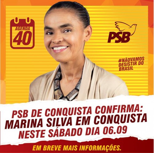Depende apenas no aval de Marina Silva (PSB/ Rede) a confirmação de uma agenda da candidata à Presidência da República em Brumado e Vitória da Conquista no próximo sábado (6). De acordo com a assessoria da candidata ao governo da Bahia pelo PSB, Lídice da Mata, há uma previsão de que Marina participe de um evento de campanha nos dois municípios, agenda anteriormente acordada pelo ex-candidato Eduardo Campos. Marina, todavia, ainda não bateu o martelo sobre a visita ao sudoeste baiano, região do candidato a vice pelo PSB, Eduardo Vasconcellos.