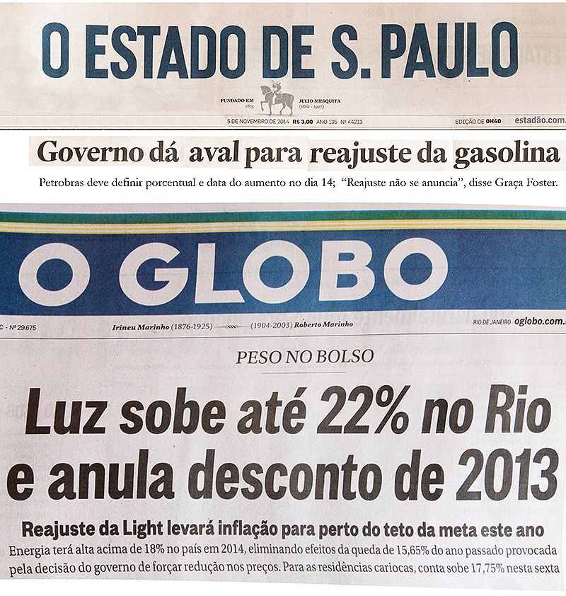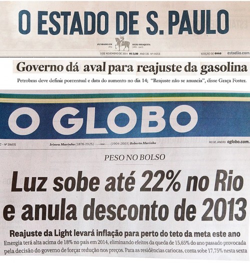 A presidente Dilma mal esperou para abrir o saco de maldades contra os brasileiros: depois do aumento da taxa de juros de 11% para 11,25% na semana passada, deu aval para o aumento da gasolina e das contas de luz. Na campanha, Dilma tentava amedrontar o país dizendo que, se eleito, Aécio adotaria medidas impopulares. Agora reeleita, a presidente mostra a sua verdadeira face, estampada nas manchetes dos jornais Estadão e O Globo de hoje. E aqueles que acreditaram no discurso da petista hoje podem se sentir enganados.