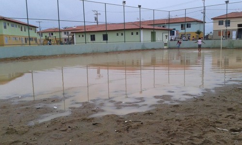 Um exemplo disto é a quadra de esportes feita ‘a migué’ e sem drenagem, que já está toda alagada, em decorrência das chuvas que caem na cidade.