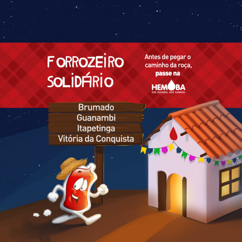 Alô moçada que vai curtir as festas juninas na Região Sudoeste! Antes dos festejos juninos, arraste o pé até uma das unidades de coleta da Fundação HEMOBA – e Doe Sangue! Então, seja um forrozeiro solidário e saiba como ajudar: http://migre.me/q8dyl
