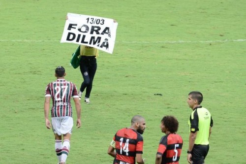 BRASILIA: Uma torcedora aproveitou o clássico entre Flamengo e Fluminense em Brasília, neste domingo (21), para fazer sua manifestação política. Segurando um cartaz com os dizeres “Fora Dilma”, ela paralisou o jogo, antes de ser rapidamente retirada pelos seguranças do estádio Mané Garrincha.