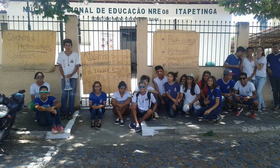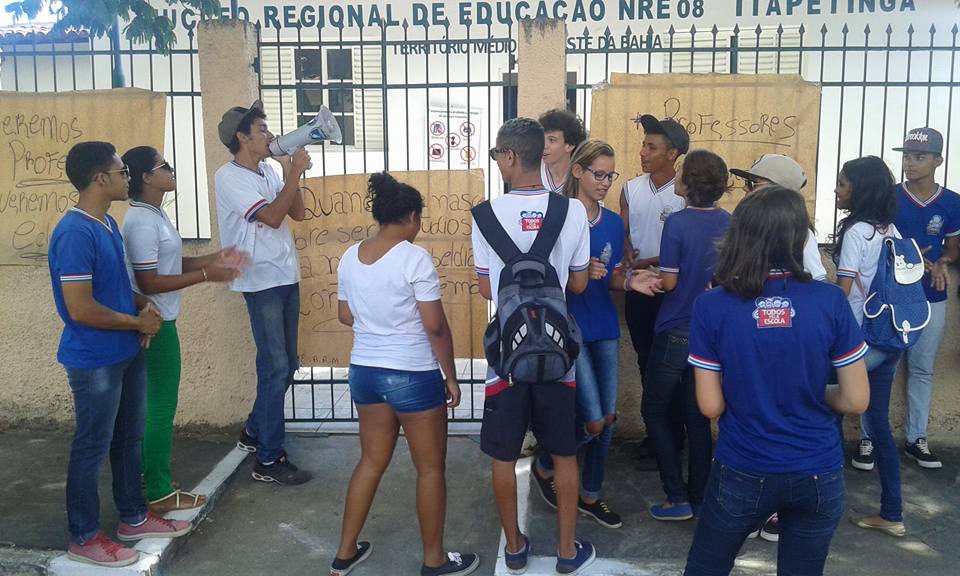 Na manhã desta terça-feira, um grupo de estudantes do Colégio Estadual Altair Almeida Meira, da cidade de Maiquinique, realizaram um protesto em frente ao Núcleo Estadual de Educação- NRE-08 (antiga Direc), sediado em Itapetinga.