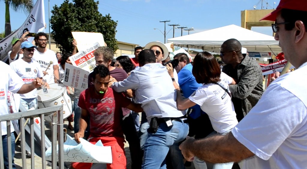 VITÓRIA DA CONQUISTA – Na manhã desta segunda-feira (22), o governador Rui Costa cumpria agenda de inaugurações em Vitória da Conquista, onde deparou com um protesto pacífico de professores da Uesb e outros movimentos. Inexplicavelmente, seguranças do governador passaram a agredir alguns manifestantes, inclusive professores da Uesb.