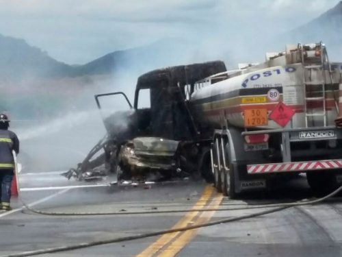 Apesar do impacto, o caminhão carregado de combustível não chegou a explodir e não há registro de feridos no veículo de carga.