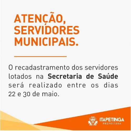 Chegou a vez dos servidores da Secretaria de Saúde. O recadastramento seguirá das 9h às 17h, de 22 a 30 de maio, na FACI – Fundação Associação Cultural Itapetinguense.