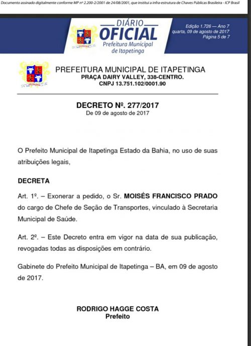 Outra exoneração que já era esperada foi a do Chefe de Seção de Transportes, Moisés Francisco Prado, motivada por incompatibilidade com parte da equipe de governo e correligionários do prefeito.