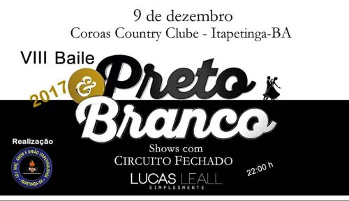 Um dos mais tradicionais eventos de Itapetinga, o Baile Preto & Branco se prepara para a sua 8ª Edição. Será realizado no Coroas Country Clube, no próximo sábado dia 09/12/2017, às 22:00. Promovido pela Loja Maçônica Amor e União Itapetinguense, o Baile terá como atrações musicais o conjunto Lucas Leall Simplesmente e a banda de baile Circuito Fechado.