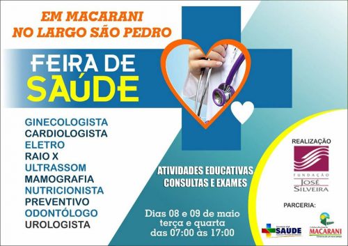Em parceria com a Fundação José Silveira, a Prefeitura Municipal de Macarani realiza nesta terça e quarta (8 e 9), no Largo de São Pedro, uma grande Feira de Saúde que atenderá toda a população do município, incluindo moradores da zona rural e distritos.