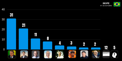 PESQUISA IBOPE: BOLSONARO, 31%; HADDAD, 21%; CIRO, 11%; ALCKMIN, 8%; MARINA, 4%