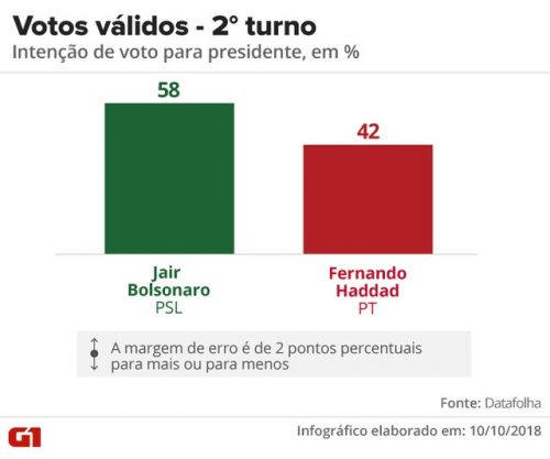 A primeira pesquisa eleitoral do segundo turno mostrou que o presidenciável Jair Bolsonaro (PSL) lidera a corrida pelo Palácio do Planalto com 54% das intenções de votos válidos. De acordo com o levantamento feito pela consultoria de pesquisa Ideia Big Data, o Candidato do PSL tem oito pontos de vantagem em relação a Fernando Haddad, representante do PT.
