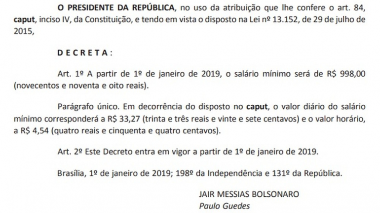 Decreto assinado pelo presidente Jair Bolsonaro e publicado nesta terça-feira (1º) em edição extra do “Diário Oficial da União” fixou o salário mínimo em R$ 998 neste ano. O valor atual é de R$ 954.