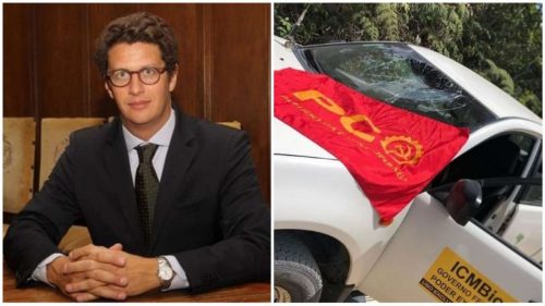 Ele divulgou vídeo e fotos que mostram um vidro trincado e uma bandeira do PCO estendida sobre o capô do carro.