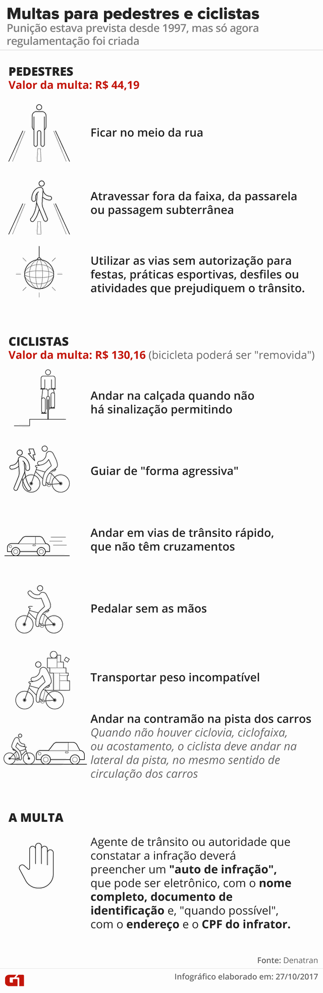 O pedestre que for pego atravessando a rua fora da faixa poderá ser multado em R$ 44,19. Já o ciclista que estiver ignorando as ciclofaixas, ou andando na contramão estabelecida para veículos ou de maneira imprudente, poderá ser multado em R$ 130,16.
