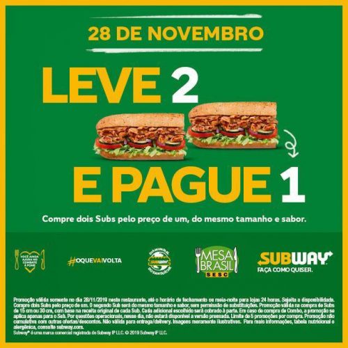Isso quer dizer que, na compra de um dos lanches participantes Subway, você ganha outro do mesmo sabor.
