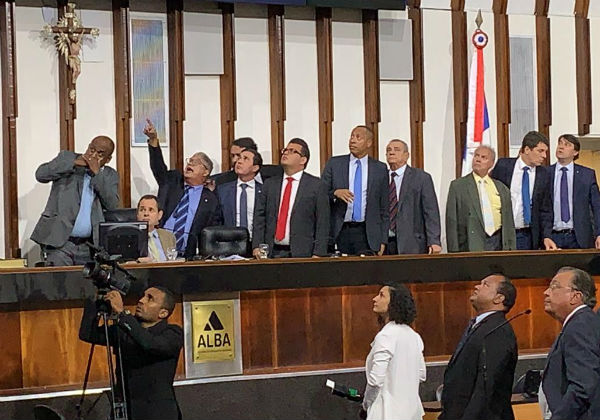 O clima foi de tensão. Houve arremesso de ovos no plenário da Assembleia Legislativa da Bahia (AL-BA), discussão, homem sendo flagrado armado e deputados migrando de sala para votar a PEC da Previdência.