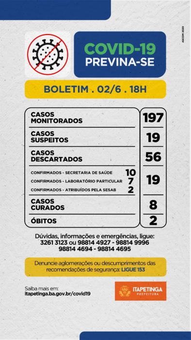 Com mais esse resultado, Itapetinga agora contabiliza 19 casos confirmados de Coronavírus. Veja boletim:
