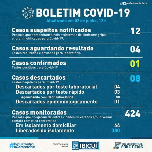 Na noite desta terça-feira, a prefeitura de Ibicuí divulgou novo boletim com mais 4 casos confirmados de Coronavírus confirmados por exames laboratoriais e teste rápido.