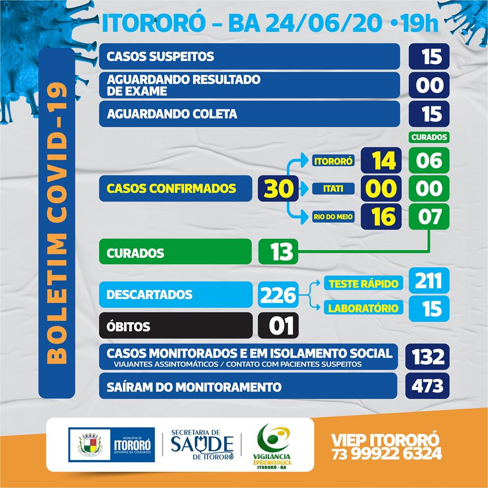A Secretaria Municipal de Saúde de Caatiba informa que na Terça-feira (23/06) não houve alteração nos casos confirmados, mantendo o total de 38 casos confirmados. Todos os casos estão em isolamento domiciliar.