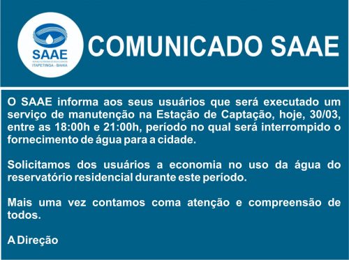 O SAAE informa aos seus usuários que será executado um serviço de entroncamento de rede de água para abastecimento do bairro Moradas do Parque. O serviço será executado em um trecho da Avenida Esperanto, o que provocará a interrupção do fornecimento de água para os bairros São Francisco de Assis e Moradas do Bem Querer, as partir das 7:00h da manhã da próxima segunda-feira, 29/03.