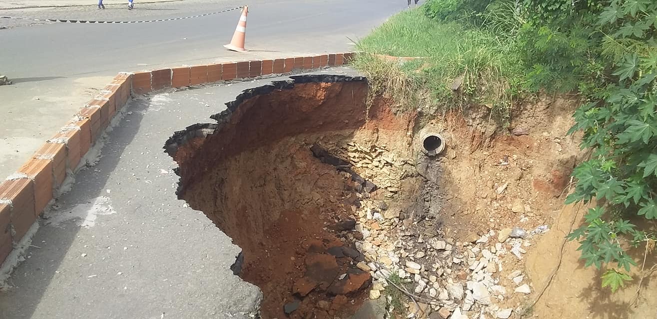 Um dos estragos dos temporais de fim de ano foi a abertura de uma enorme cratera na Avenida Isai Amorim, em Itapetinga, em frente à sede do Ministério Público. A via está sendo usada em meia pista, de forma perigosa, sem sinalização adequada.