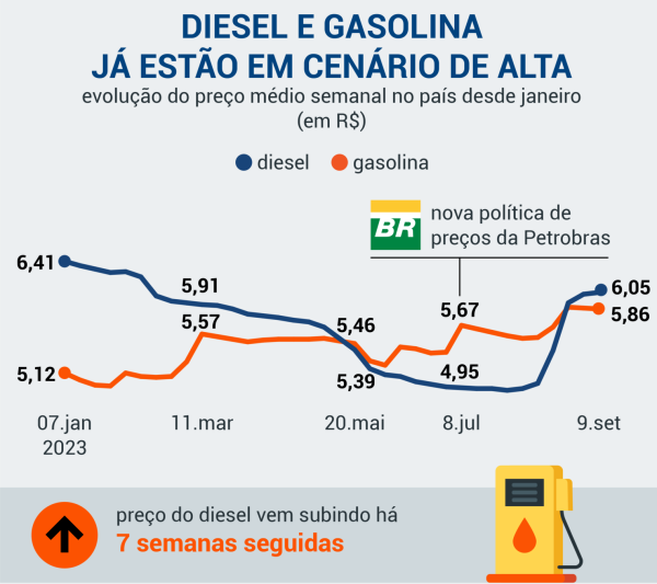 O preço do diesel alcançou R$ 6,05 na média dos postos brasileiros no período de 3 a 9 de setembro, um aumento de R$ 0,02 em comparação à semana anterior. Esse valor representa o 7º aumento consecutivo no valor do combustível.