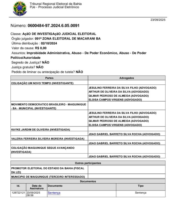 A decisão foi proferida pela juíza eleitoral Giselle de Fátima Cunha Guimarães Ribeiro, no processo Ação de Investigação Judicial Eleitoral (AIJE) nº 0600484-97.2024.6.05.0091, ajuizado pela coligação “Um Novo Tempo” e pelo MDB municipal.