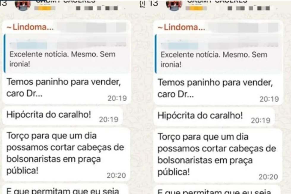O comentário foi feito durante um debate no grupo sobre o senador Flávio Bolsonaro (PL-RJ). Além da incitação à violência, Lindomar também direcionou ofensas pessoais a um dos participantes do fórum, a quem chamou de “hipócrita”.