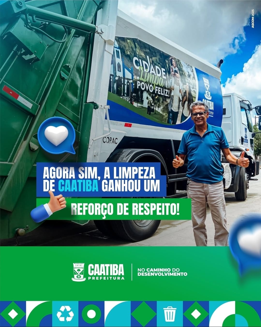 “Chegou reforço importante para nossa cidade! Esse carro compactador vai facilitar a vida dos nossos profissionais da limpeza e ajudar a manter Caatiba organizada, mostrando que nosso compromisso é com o cuidado da cidade e o bem-estar de todos.”